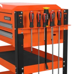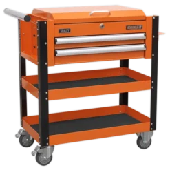 - Garage or workshop trolley with two shelves and a lockable gas sprung supported lid, which allows for items to be kept safe when not in use.