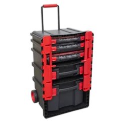 - Fully mobile with two heavy-duty wheels and a retractable handle.