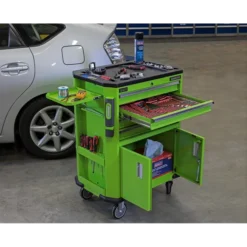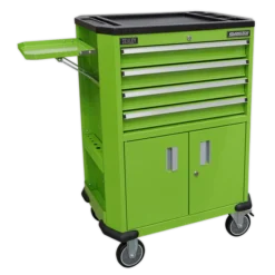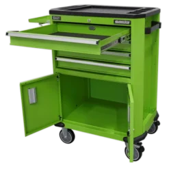 - Top of the trolley is covered in tough composite with built-in storage for small parts.