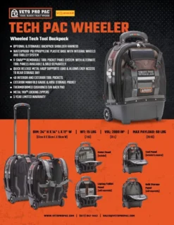 The TECH PAC WHEELER is a rolling version of the best-selling TECH PAC backpack tool bag. Featuring additional volume capacity & Veto Pro Pac’s proprietary V-SWAP™ system that offers the back meter panel to be swapped out with optional laptop or bulk storage panels (both sold separately), the TECH PAC WHEELER provides a versatile tool transport system functioning as both a wheeled and backpack tool bag.